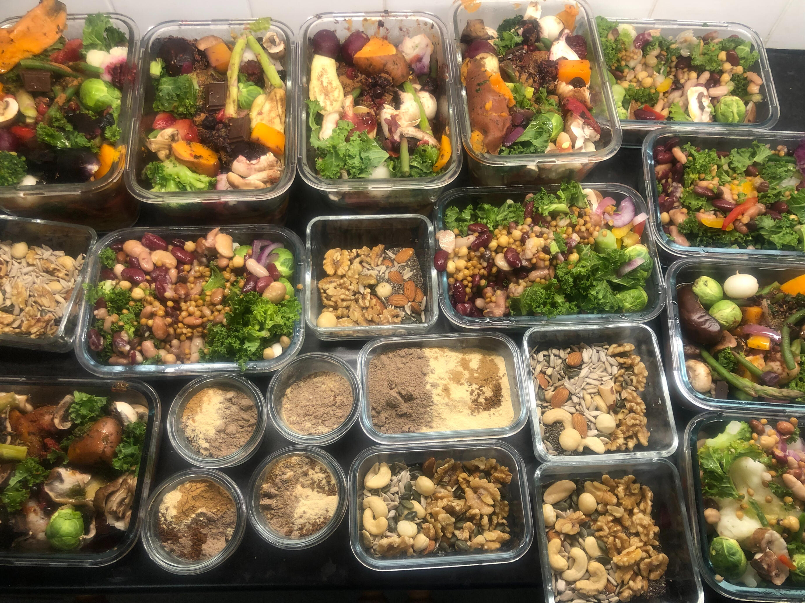 >250g beans, lentils, and/or chickpeas. Make sure that the cans are BPA-free. The beans are pre-cooked, so I just eat them from the glass, but you could rinse them with water in a sieve. There are many bean types you can try for variation, for example white or black beans. I complement beans with pre-cooked lentils, usually beluga (e.g., from Merchant). You can also cook the lentils (Boil water, add lentils, and cook without a lid for around 20 min at low heat, before rinsing them under cold water).